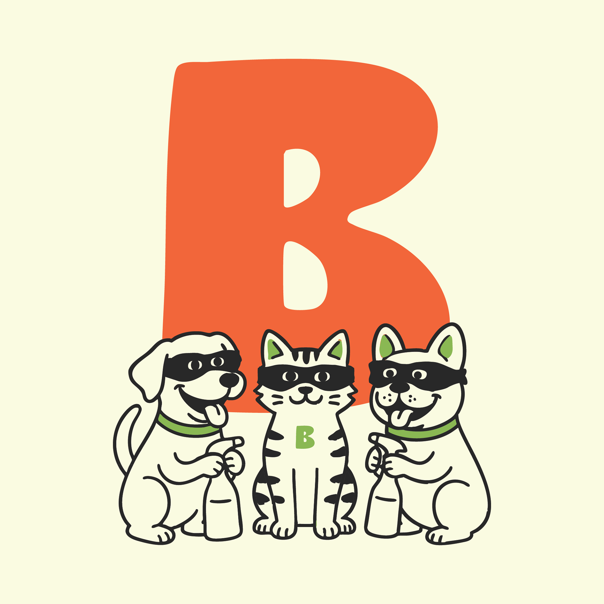 The visual identity is centered around illustrated bandit mascots—pets turned heroes—designed to bring memorability and emotional connection to the category. Bold typography, warm color palettes, and simple iconography help create strong shelf presence while maintaining clarity and accessibility.